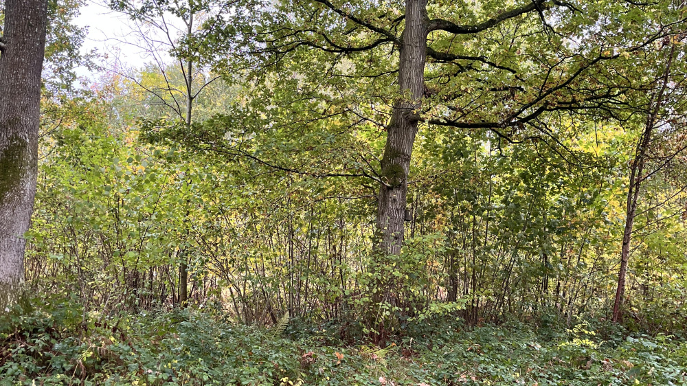 Lovely mix of native broadleaf here, with majority oak but also some lovely specimens of sweet chestnut, one or two fabulous beech as well as birch, cherry, some alder and quite a quantity of hazel at understory, much of which has been managed over several years as coppice. Also at understory can be found holly and hawthorn, field maple and sycamore, many interwound with copious amount of honeysuckle.
