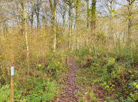 There is a small area of level ground in the southern sector of the woodland, with a forest path running along ten metres or so inside, roughly parallel with the southern boundary. There is a small glade here providing space for a working area and possibly a shelter for cups of tea and storage for tools. A short distance northward from here, the ground falls away fairly steeply down towards the brook which runs along the bottom of the valley. Mature oak, chestnut and beech populate this area, with shrub sized holly and hazel between, some of which has been coppiced, and an open forest floor with many ferns and various wildflowers throughout the year. A narrow footpath descends diagonally to the bottom of the slope in the north eastern corner of the woodland, bringing you to the southern bank of Millhalf Brook.