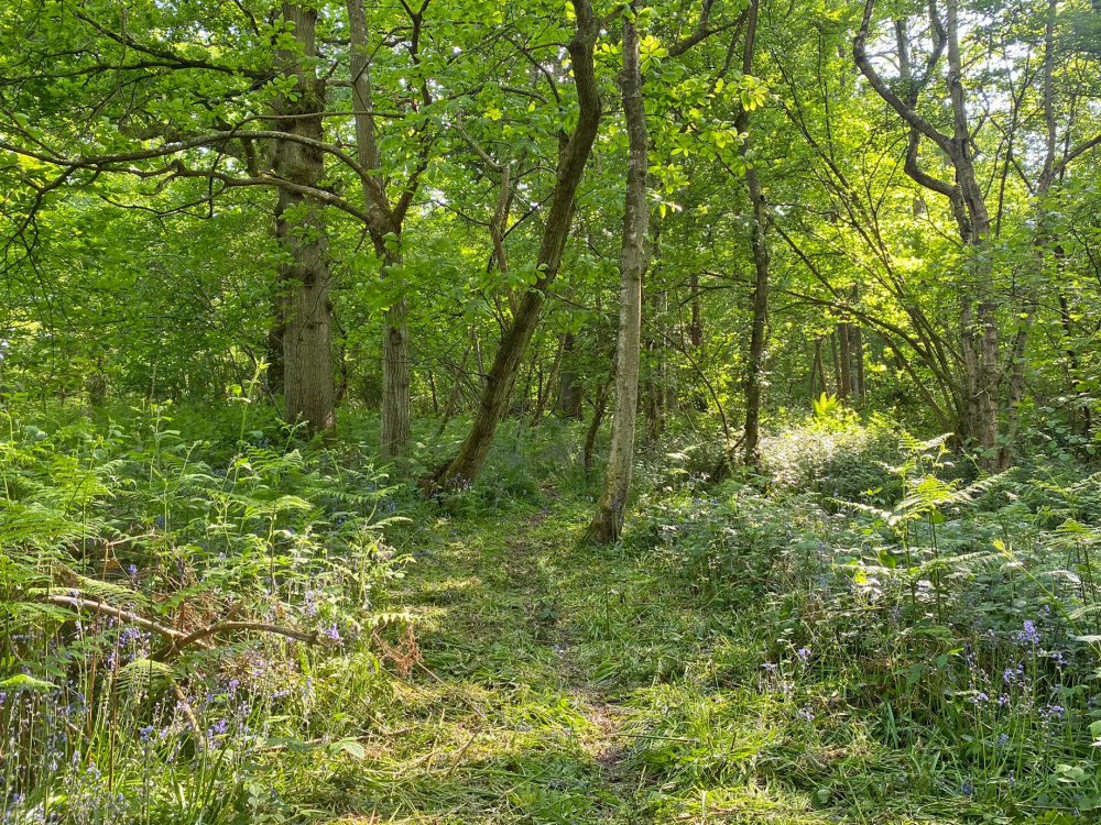 An extremely private ancient woodland with gently sloping topography and a pretty stream. Oak, sweet chestnut, alder, ash, hazel and silver birch feature. Bluebells, yellow archangel, red campion and hard ferns can be found, all of which are ancient woodland indicators.
