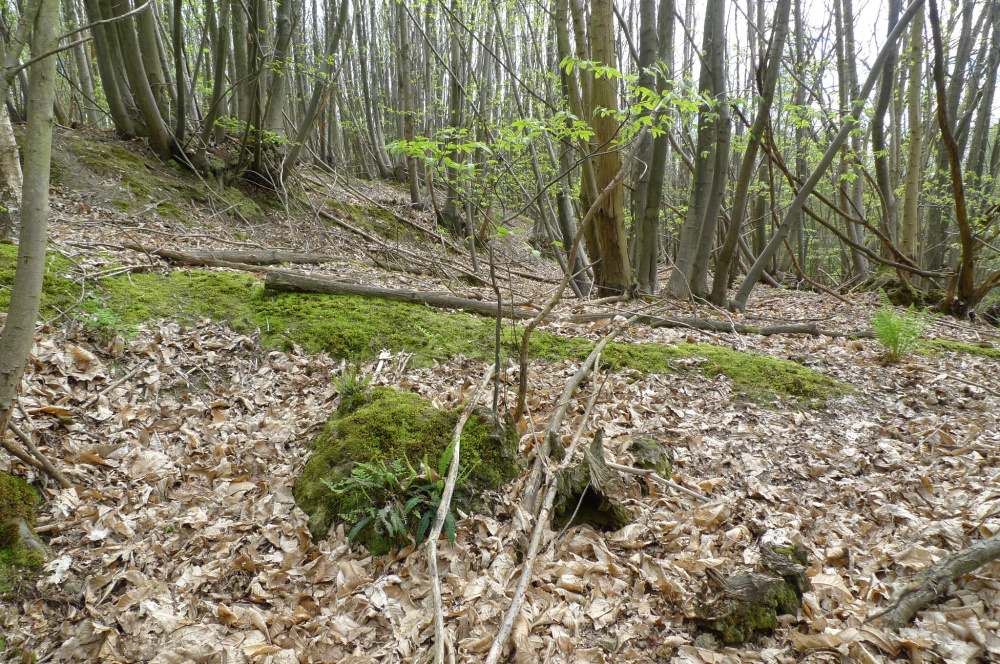 A beautiful bluebell woodland on a sloping site, mature oak and lots of sweet chestnut, a prime archaeological site waiting to be explored.