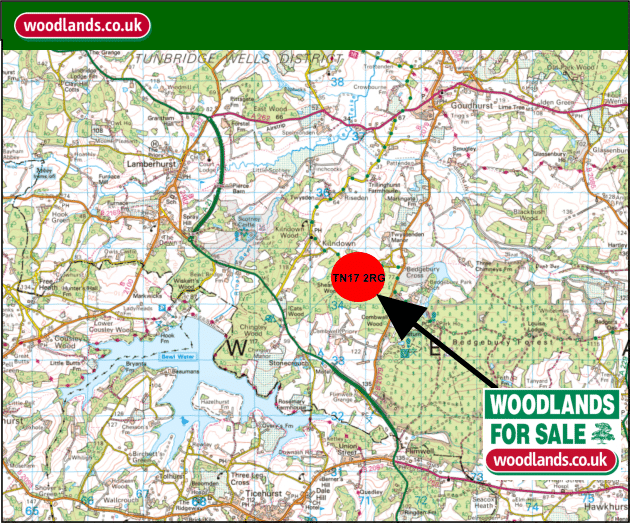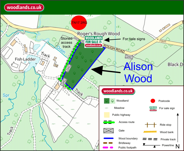 - Take the first right onto Chicks Lane just before Kilndown and the next right turn on the Rogers Rough Road. Just under half a mile down Rogers Rough Road there is a track entrance with wooden gates on the right-hand side. This track leads to the entrance to Alison Wood. Turn down the track and approximately 120 meters the entrance to Alison Wood is on your left-hand side with its boundaries marked in BLUE. There is a small Woodlands For Sale sign by the gate post.