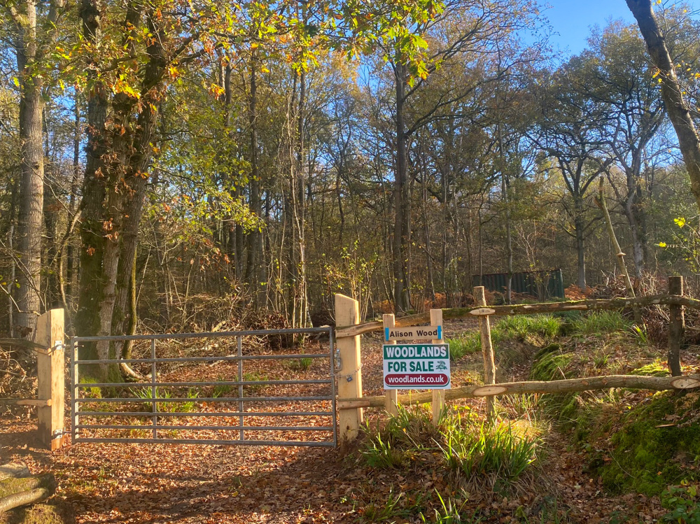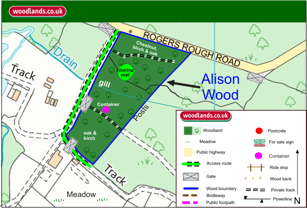 Alison Wood is easily accessed from a quiet country lane, Rogers Rough Road. A private stoned track provides access to the wood. There is a newly installed locked metal gate at the entrance to Alison Wood and a secure place for a new owner to park within the wood itself. There are no public footpaths in or adjoining the wood.