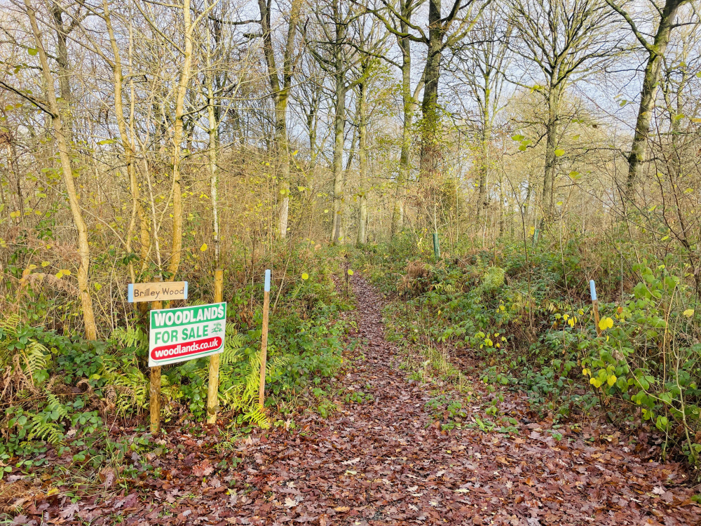 Continue on foot , over the stile and follow the main track until you come to the entrance to Brilley Wood on your right, at the end of the track, marked by a ride stop with a wooden name board and a Woodlands for Sale sign.