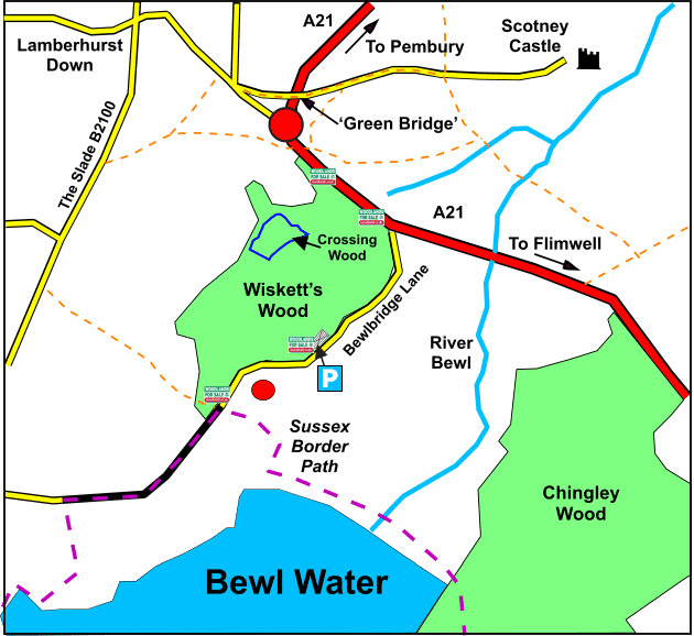 Please note, for satellite navigation, use the post code TN3 8JH. This will take you to the area as shown by the red dot on the map. Coordinates to the gate leading to Crossing Wood (off Bewlbridge Lane) are: N51.083661, E0.397466. To find the wood follow the instructions below.