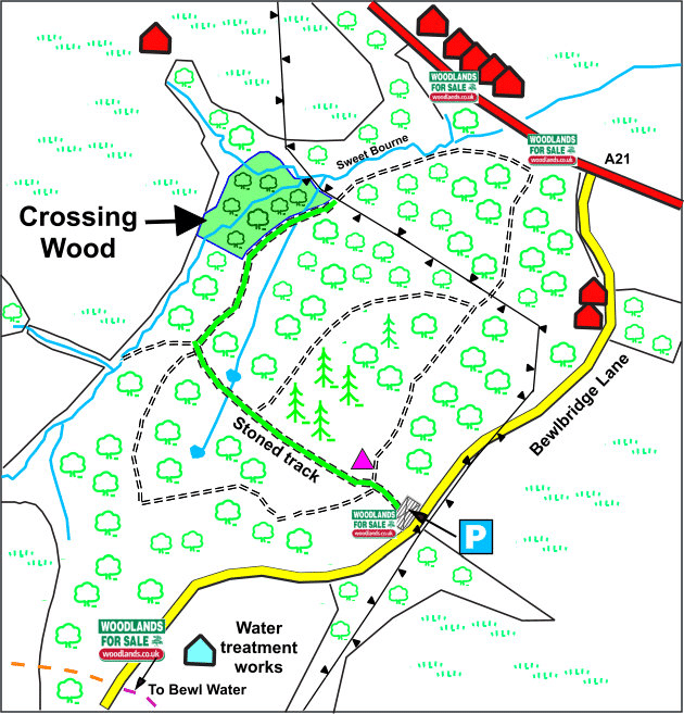 Crossing Wood is easily accessed from a quiet country lane (Bewlbridge Lane), through a locked metal gate (an owner will be provided the combination number for this locked gate). A stoned track leads to the ride stop entrance to Crossing Wood. A small area of hardstanding allows a new owner to park within the boundary of Crossing Wood itself.