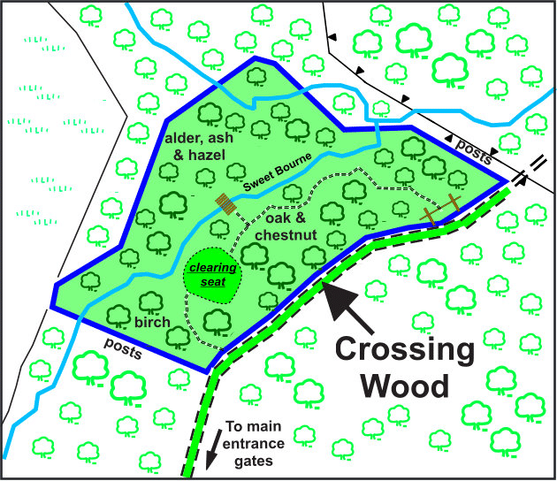 Crossing Wood is a riparian (‘relating to or living or located on the bank of a natural watercourse’) area of woodland following the streams shallow banks. Tree species include splendid mature oak, sweet chestnut, alder, ash and silver birch. Some hazel coppice stools are scattered through the wood. There is evidence of natural springs on the west side of the wood, which feed into the stream.