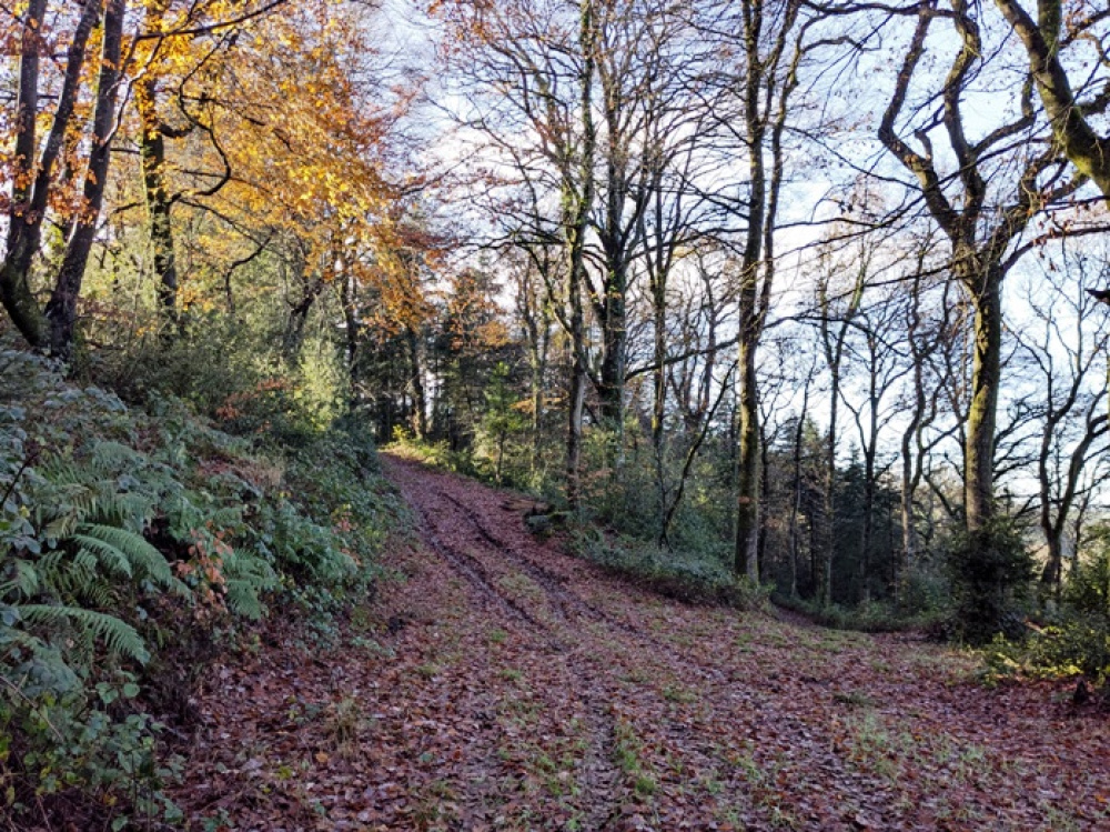 - At the first fork take the left hand track that heads up hill to the top of the woodland and stay on this track for around 800 metres until you come to another fork in the track just past a bench.