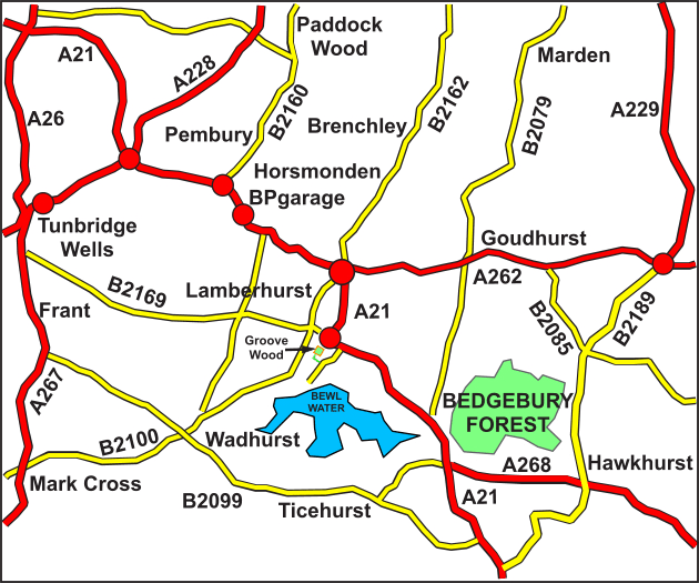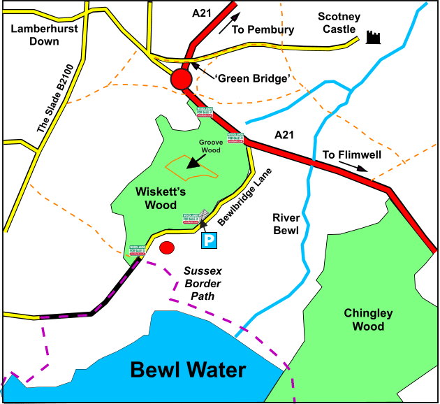Please note, for satellite navigation, use the post code TN3 8JH. This will take you to the area as shown by the red dot on the map. Coordinates to the gate leading to Groove Wood (off Bewlbridge Lane) are: N51.083661, E0.397466. To find the wood follow the instructions below.