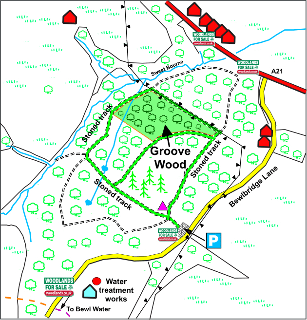 Groove Wood is easily accessed from a quiet country lane (Bewlbridge Lane), through a locked metal gate (an owner will be provided the combination number for this locked gate). There are 2 stoned tracks providing access to the wood (one to the east side and one to west side). There is an additional 3rd unsurfaced track providing access to the southeast side of the wood. (see ‘Wood Maps’). There is a place for a new owner to park within the wood itself.