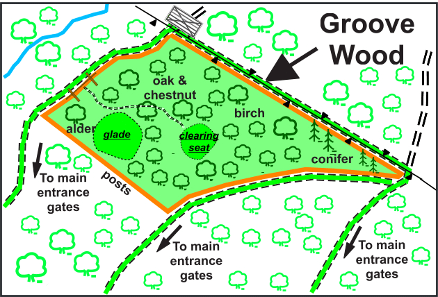 - Walk under the gate and up the track past the telecom mast and down the stoned track approx. 400 meters. Take the turn to the right (following the stoned track) and continue approx. 215 meters. The ride stop entrance to Groove Wood is on the -right-hand side with its boundaries marked in ORANGE.