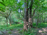 A mainly broadleaved wood – with mature oak, single stemmed sweet chestnut seed trees, silver birch, ash, alder and wild cherry. In the northeast of the wood there is a small stand of conifer – larch and Douglas fir.