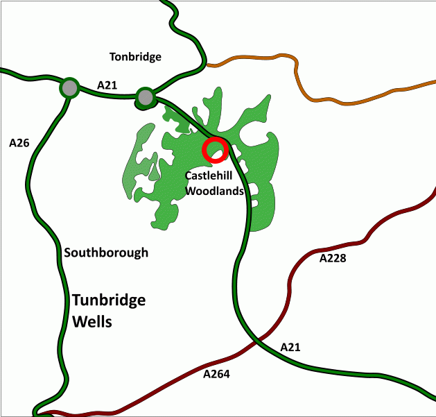 Hillfort Wood, at Castlehill, is about 4 miles north of Tunbridge Wells centre and about 3 miles southwest of Tonbridge, see maps and photos.