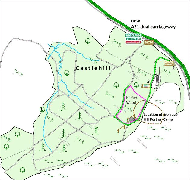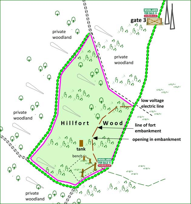 - Hillfort Wood will be seen on the right, with mauve markings