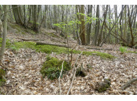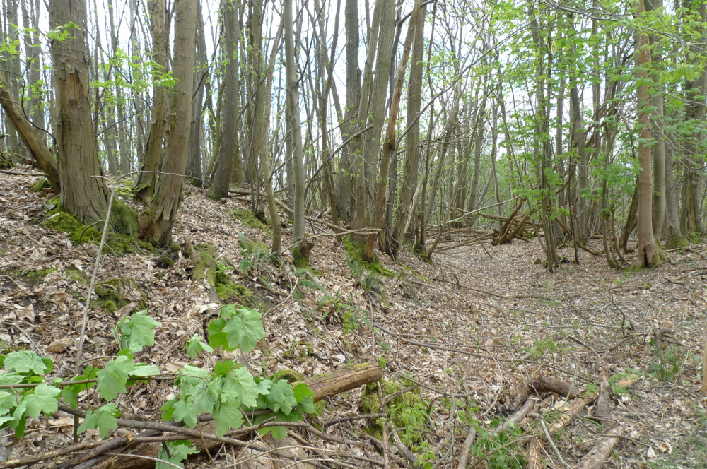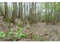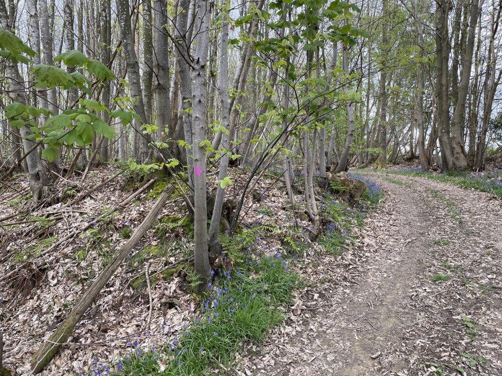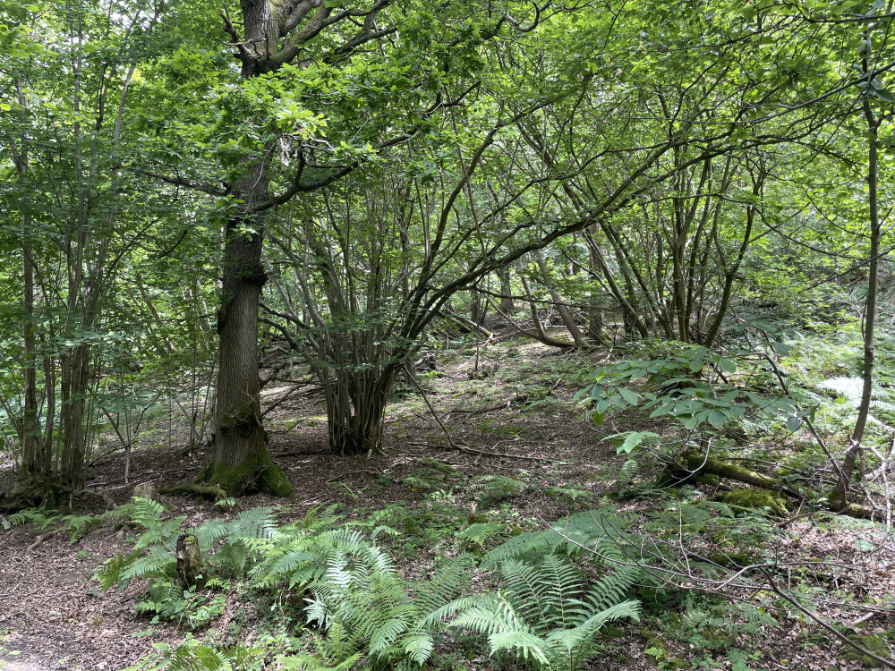 A beautiful bluebell woodland on a sloping site, mature oak and lots of sweet chestnut, a prime archaeological site waiting to be explored.