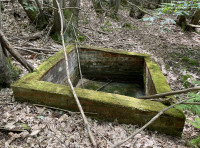 There is a small brick water tank, this is probably built on an 'issue' (where a spring emerges) to collect and store water. It's likely a steel pipe takes water to points below, we don't know where and it's doubtful if it works now. But this would be a good place for a personal water supply.
