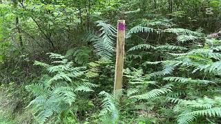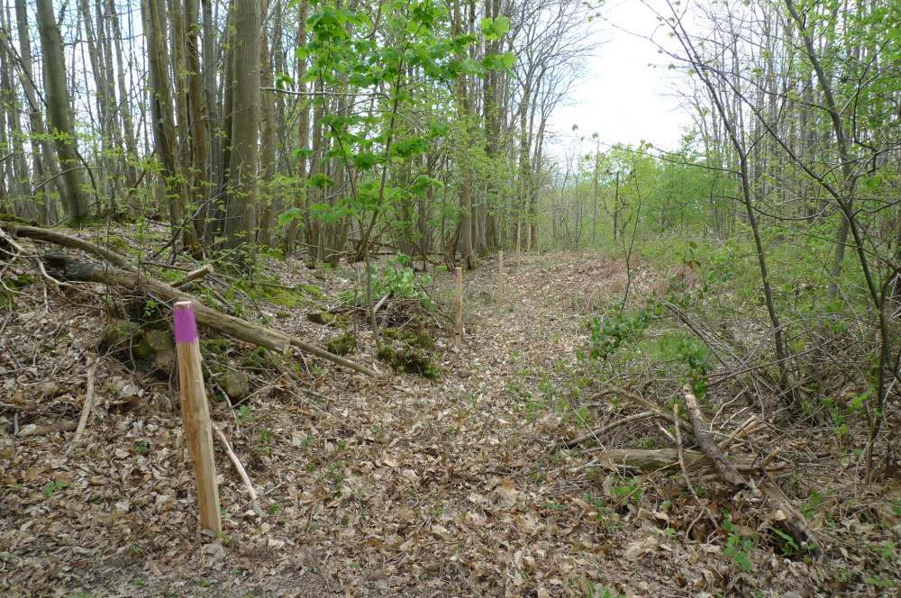 These are indicated by mauve markings on trees and free-standing posts. The boundaries are the trackside to the southeast, south and northwest. To the northeast it is the edge of the electricity wayleave where there are boundary posts.